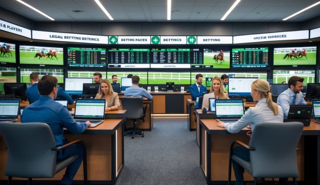 Suasana kantor taruhan balap kuda resmi dengan pemain profesional yang sedang menganalisis dan memasang taruhan menggunakan perangkat elektronik.